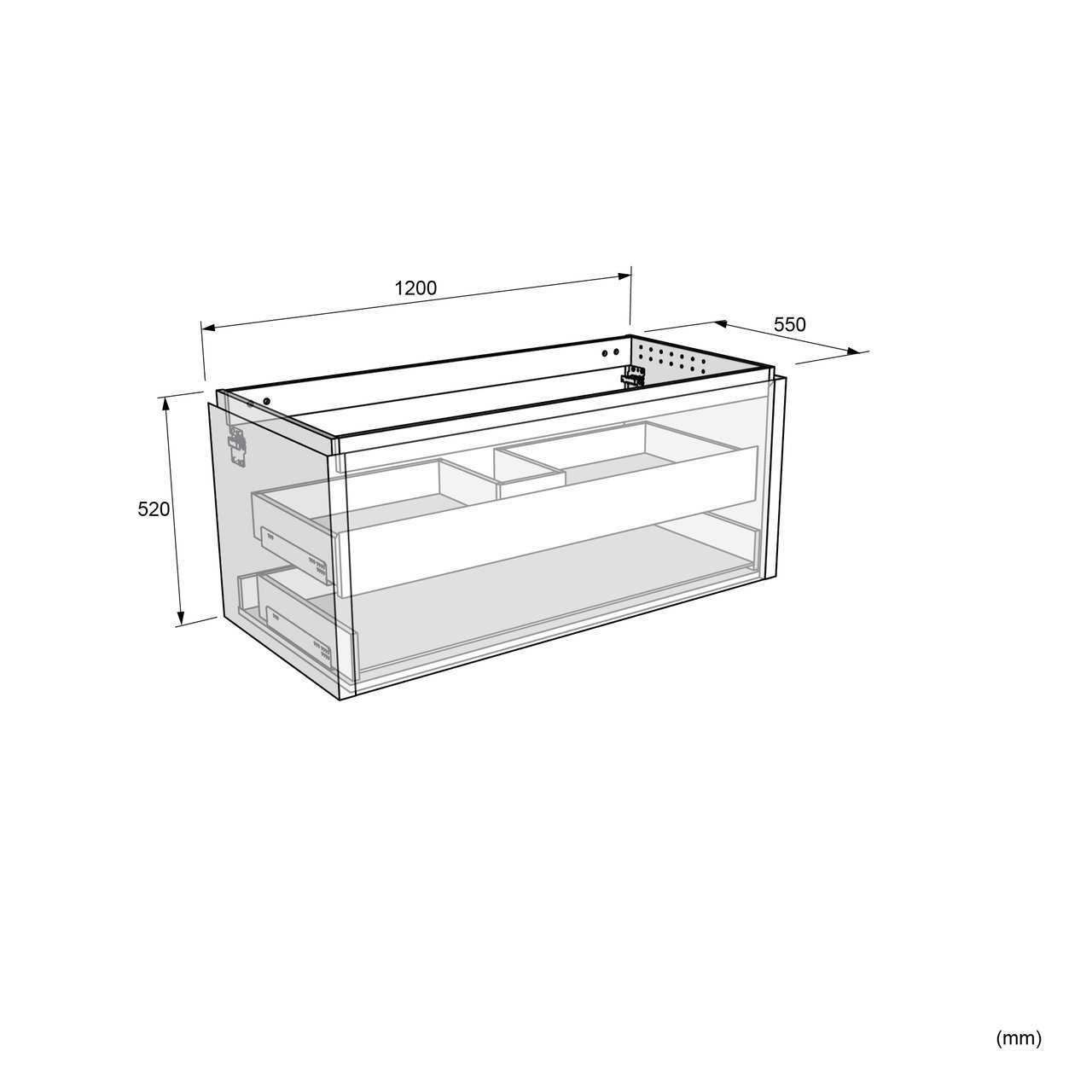 Das Badezimmermöbel ist 120 cm breit und aus Massivholz gefertigt.