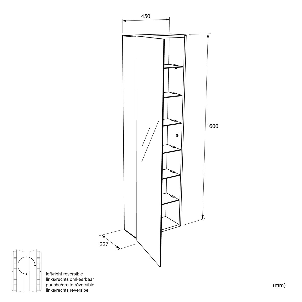 Der Hochschrank mit Spiegel aus Aluminium mit einer Tür hat eine Breite von 45 cm, eine Höhe von 160 cm und eine Tiefe von 22 cm. Dieser Hängeschrank in schwarz matt ist in einem modernen, minimalistischen Design ausgeführtund lässt das Badezimmer als stilvollen Blickfang erscheinen.