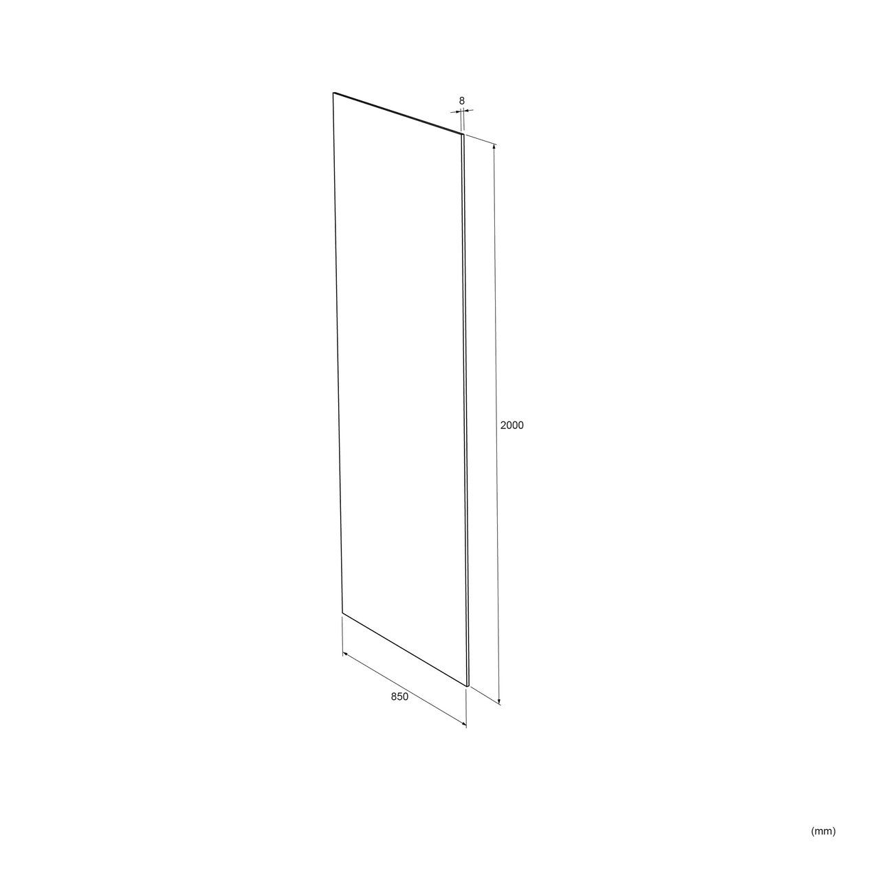 Stilvolles und sicheres Glaspaneel zur Vervollständigung einer Walk-In-Dusche. Dieses Glaspaneel ist 85 cm lang, 200 cm hoch und 8 mm dick.