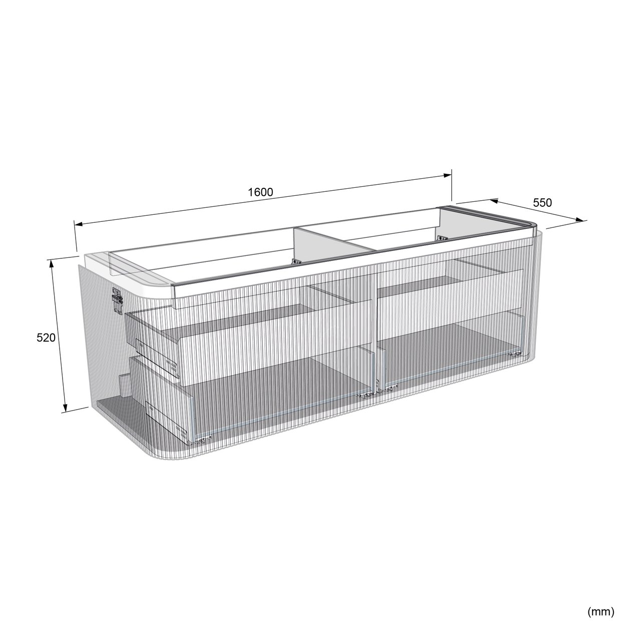 Das Badezimmermöbel ist 160 cm breit und aus Massivholz gefertigt.