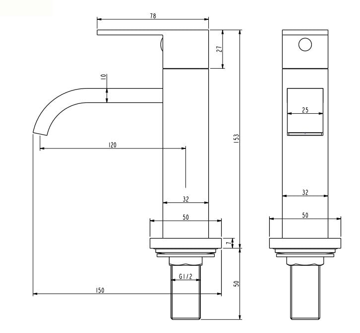 • Design: Armaturenkörper ist ein Halbkreis mit flachem Abfluss in einem Bogen und abgerundetem Grif f