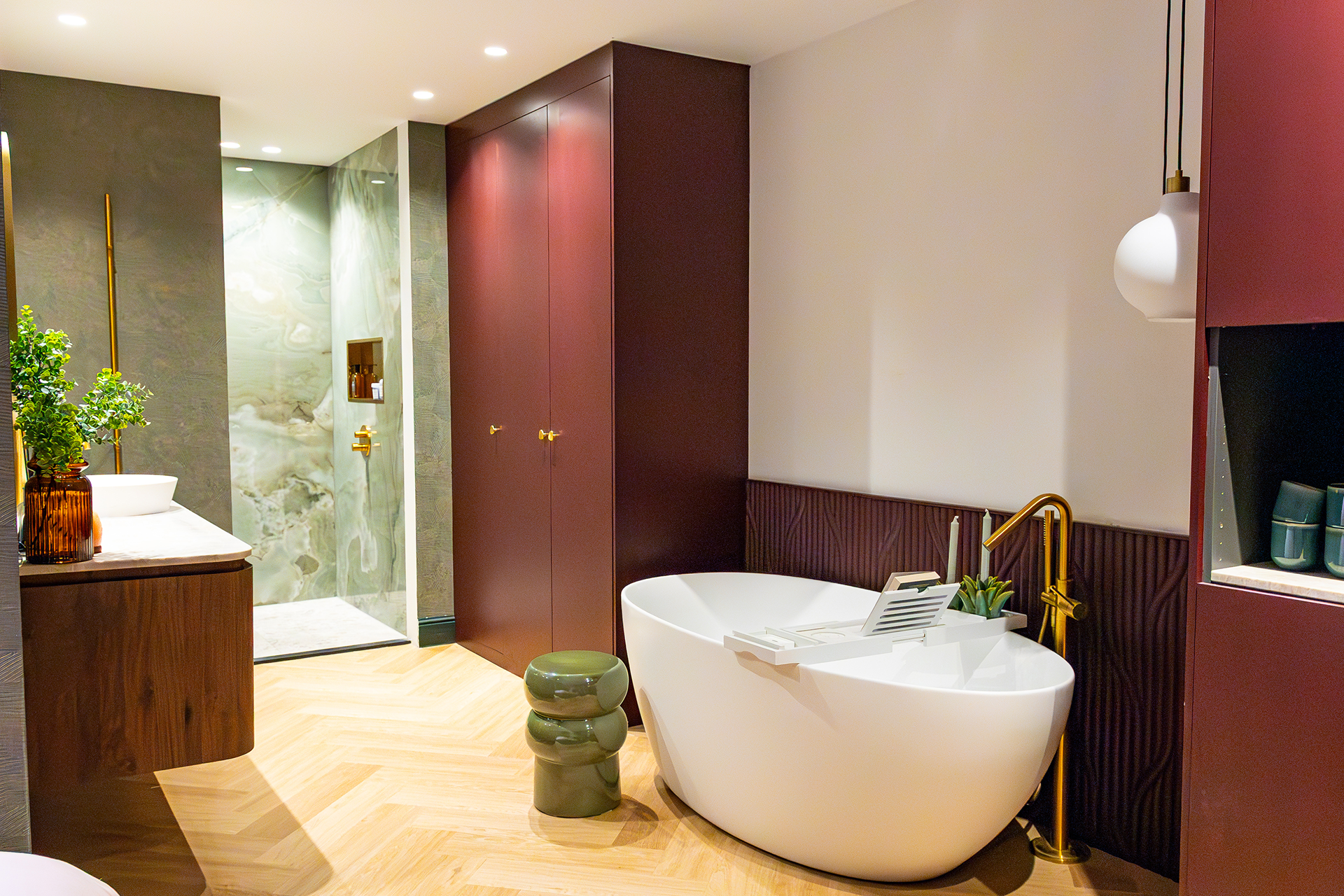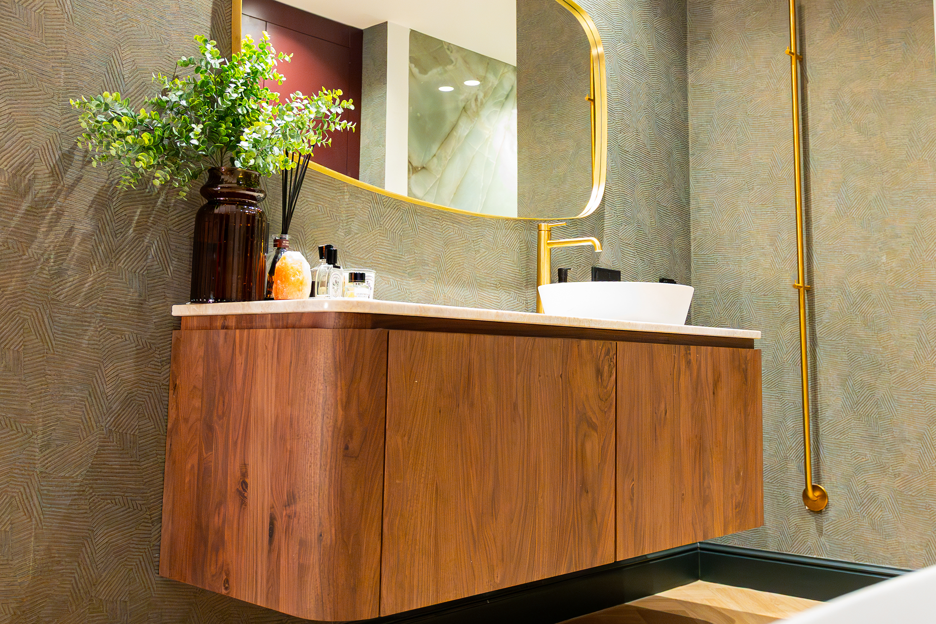 In diesem Badezimmer trifft Stil auf Persönlichkeit. Die tropische Tapete im WC, kombiniert mit tiefem Bordeaux, Gold und Marmor, schafft einen einzigartigen Mix aus Eleganz und Ausdruck. Die freistehende Badewanne mit goldener Armatur ist ein echter Blickfang – harmonisch ergänzt durch warme Materialien und hochwertige Details.
