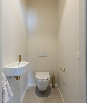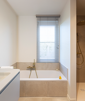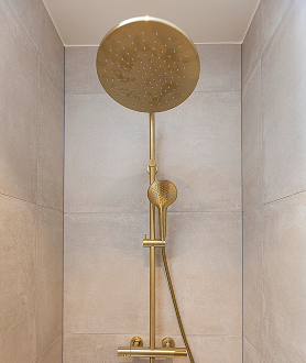 Ein Badezimmer, das zurückhaltenden Luxus ausstrahlt. Die goldenen Armaturen, weichen Rundungen und neutralen Farbtöne schaffen ein Gefühl von Wärme und Stil.