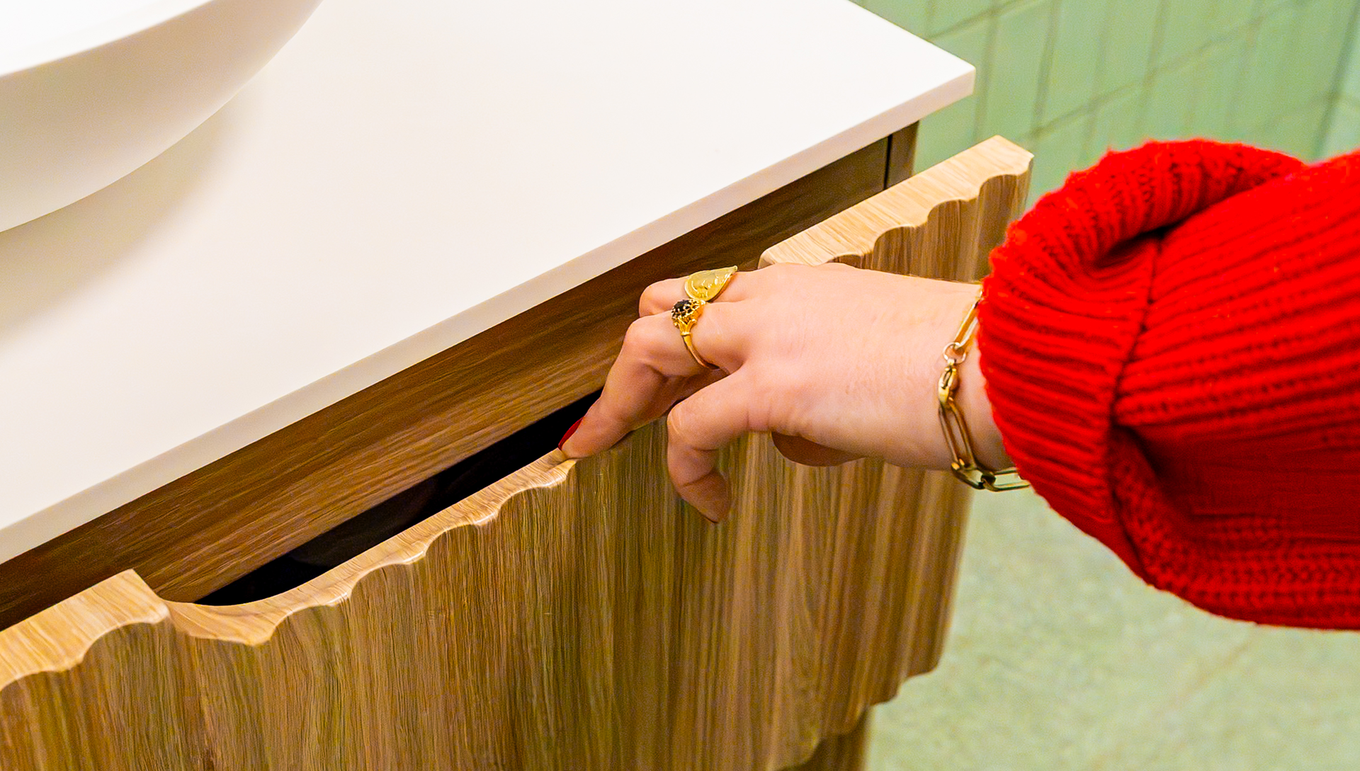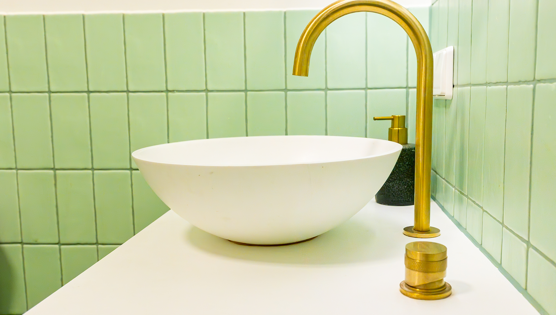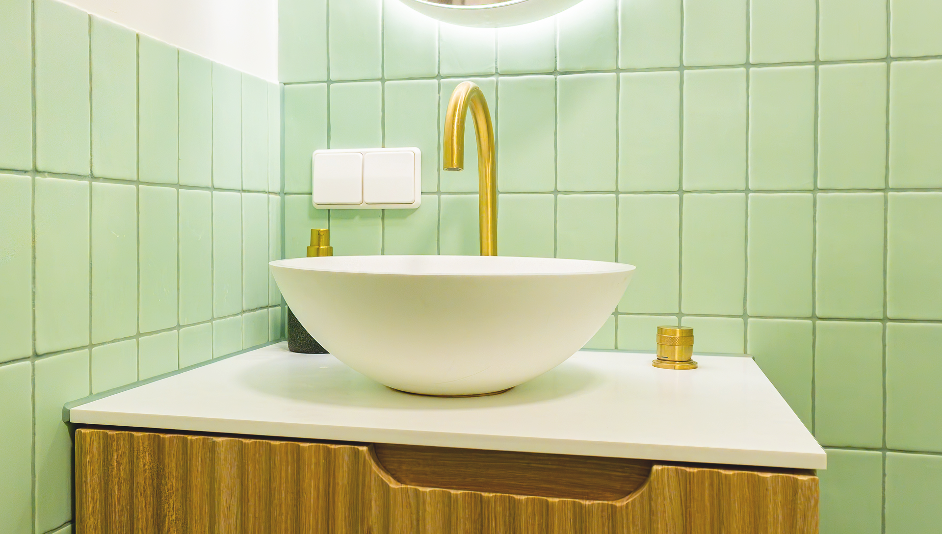 Diese Badezimmergestaltung überrascht mit retro-inspirierten Salbeigrün-Fliesen und edlen goldenen Armaturen. Das geriffelte Holzmöbel, die runde Aufsatzwaschbecken und die sanften Kontraste schaffen einen Raum volles Charakter.