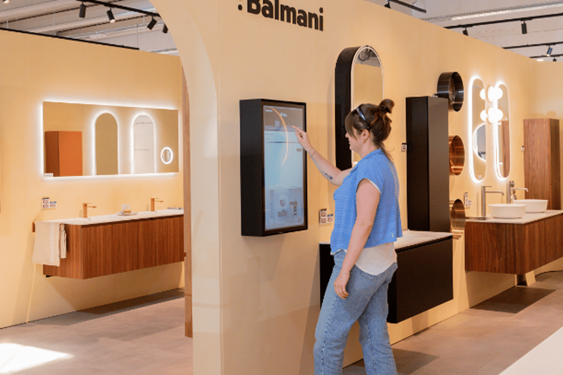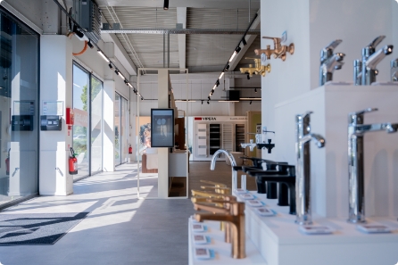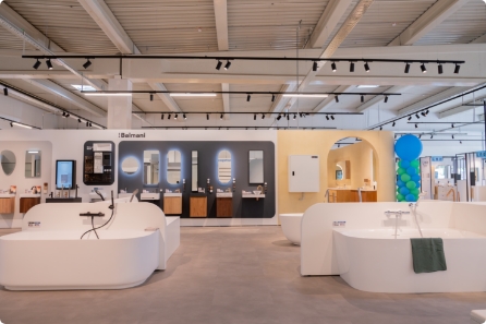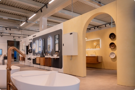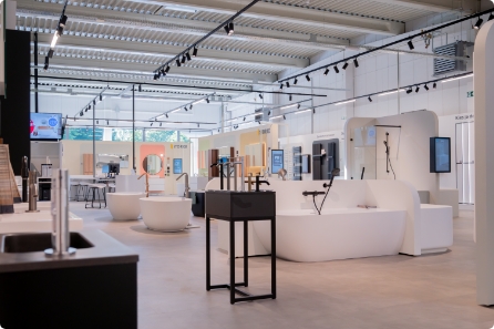 Neben den vielen Bildschirmen gibt es auch zahlreiche echte Produkte zu entdecken. Inspirierende Beispielbäder laden dazu ein, alle Farben und Texturen hautnah zu erleben.