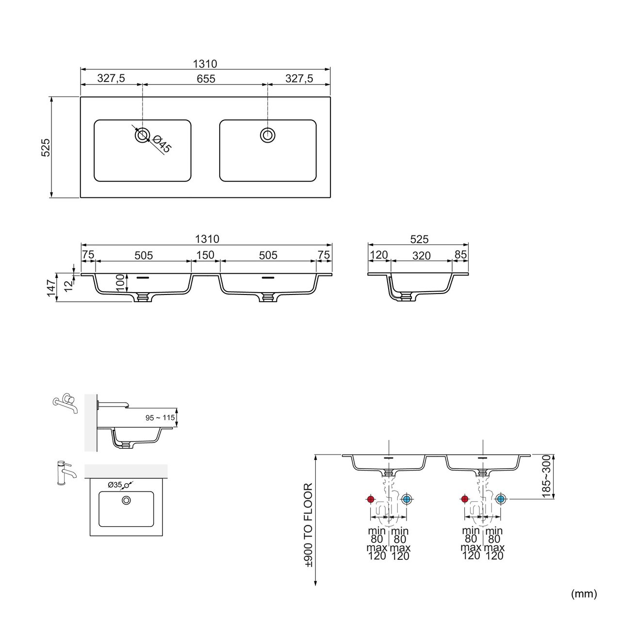 Maße | 130 x 52 cm Doppelwaschtisch | |