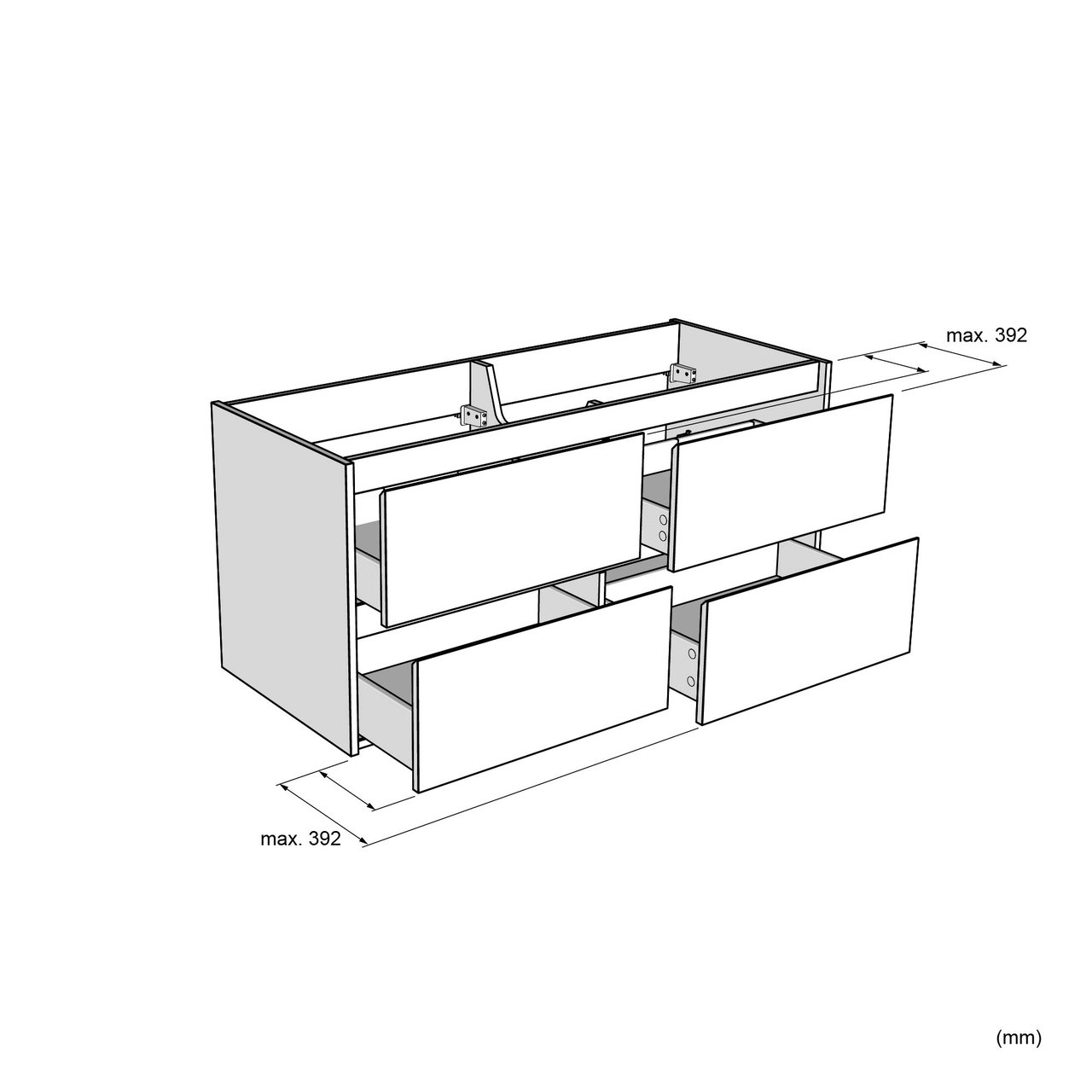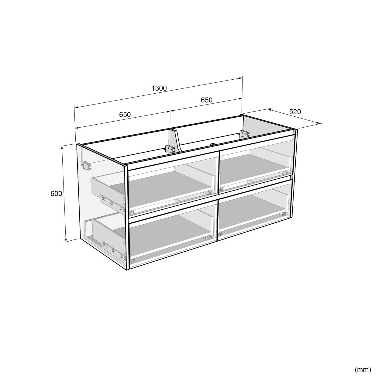 Dieser Bad-Unterschrank aus Melamin mit 4 Schubladen hat eine Breite von 130 cm, eine Höhe vom 60 cm und eine Tiefe von 52 cm. Dank seiner eleganten Verarbeitung passt der Hängeschrank in Eiche roh in jedes Badezimmer.